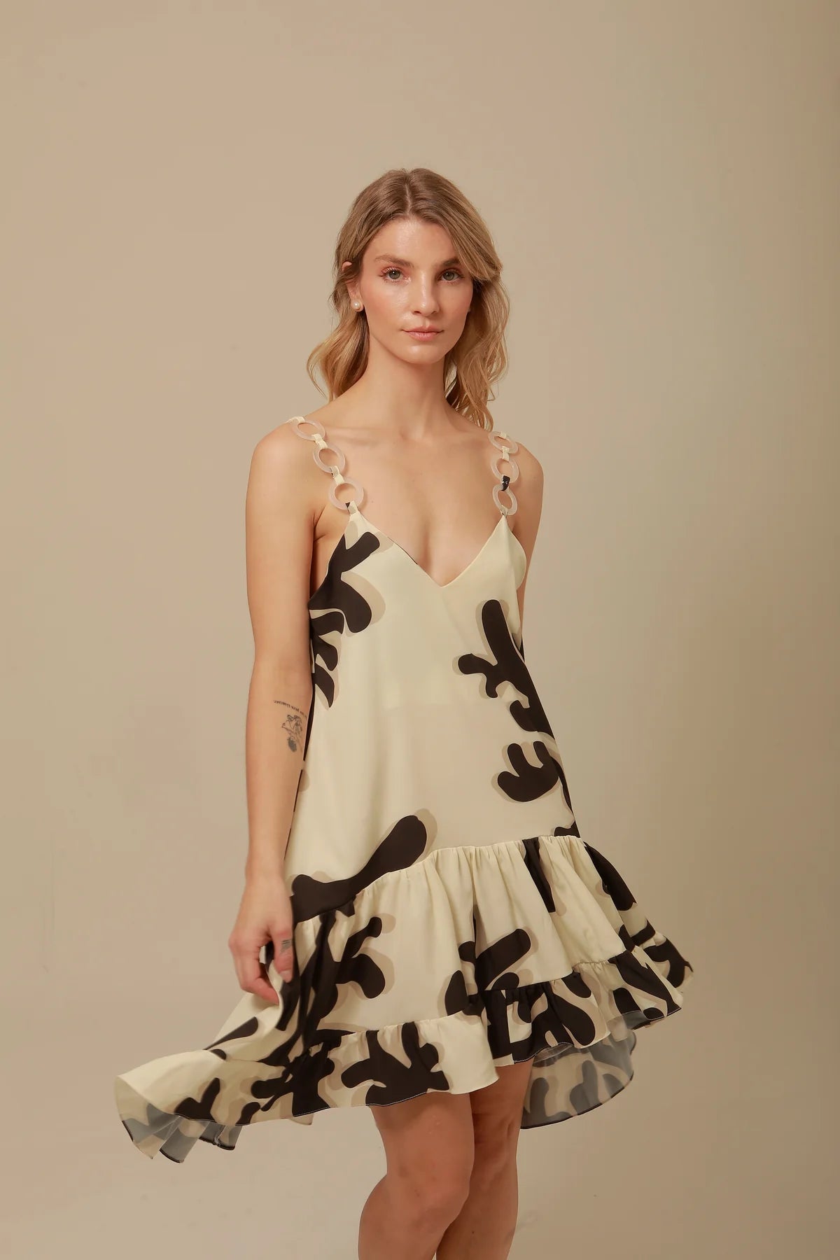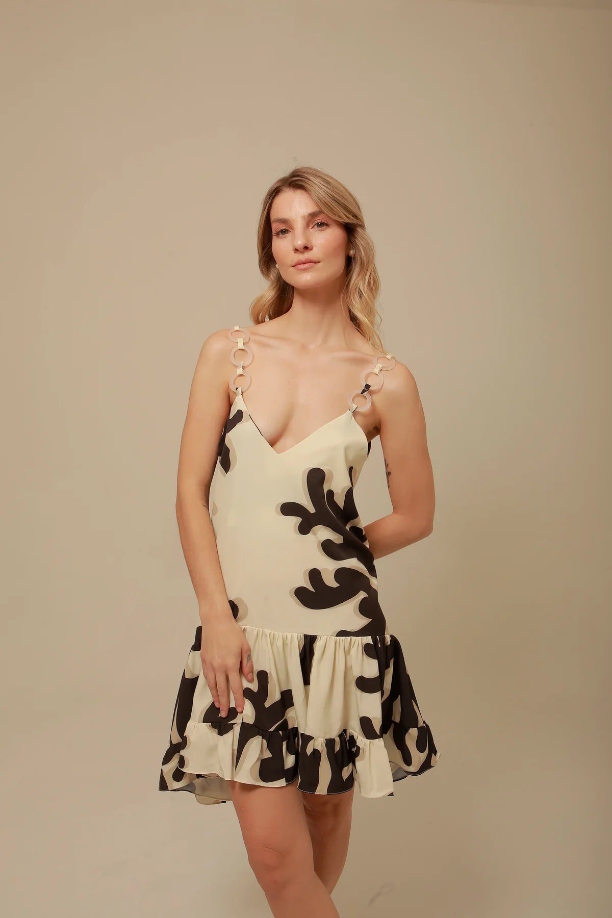 Vestido mini. Cuello en V. Sin mangas. Detalle en la parte posterior del vestido.